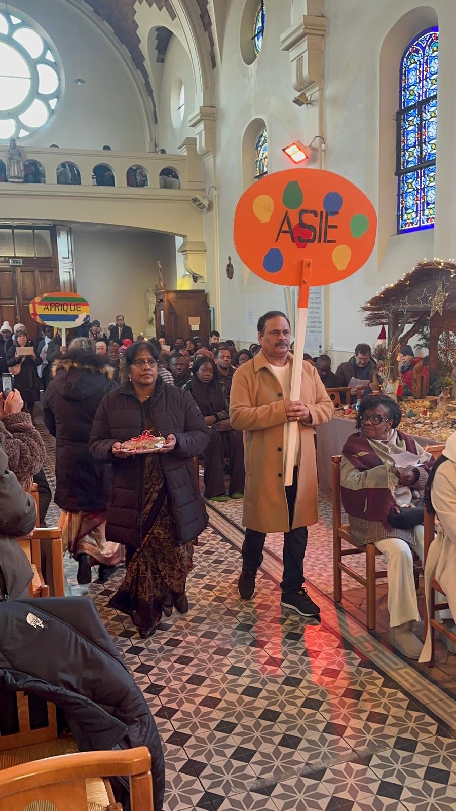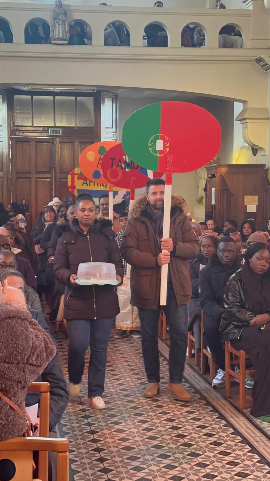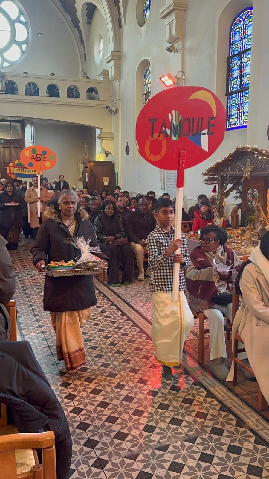 La célébration a débuté par une procession des offrandes qui a fait voyager l’assemblée à travers 7 pays, représentés par leurs panneaux et leurs spécialités culinaires : la France, les pays de l’Est, la communauté tamoule, le Portugal, l’Asie du Sud-Est, les Antilles et l’Afrique. Ces offrandes, symboles de la générosité et de l’identité culturelle de chacun, ont nourri notre prière commune et incarné la beauté de l’Église universelle.