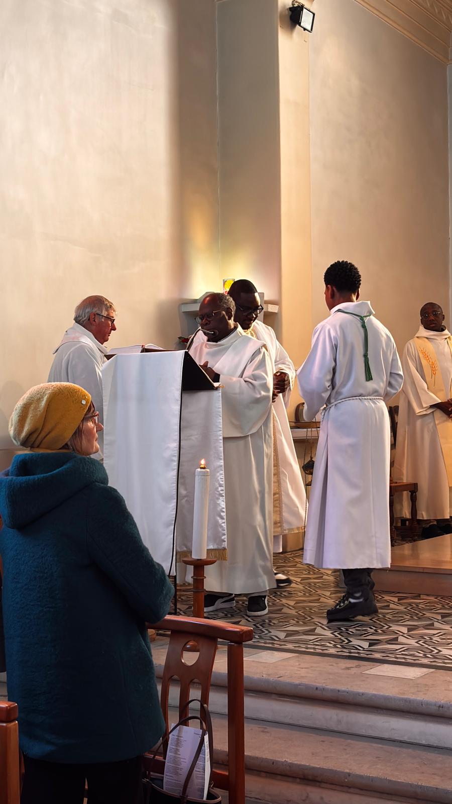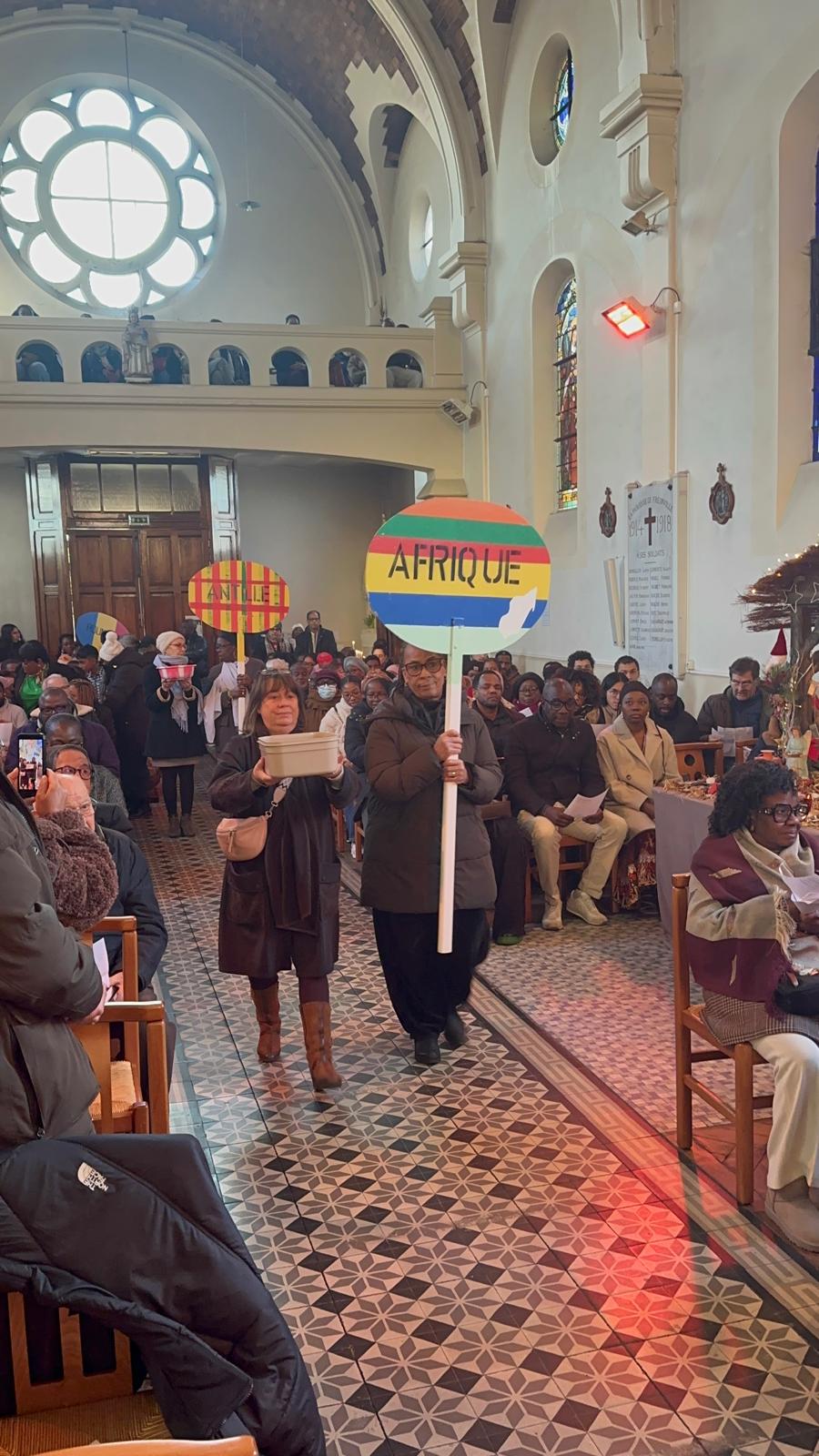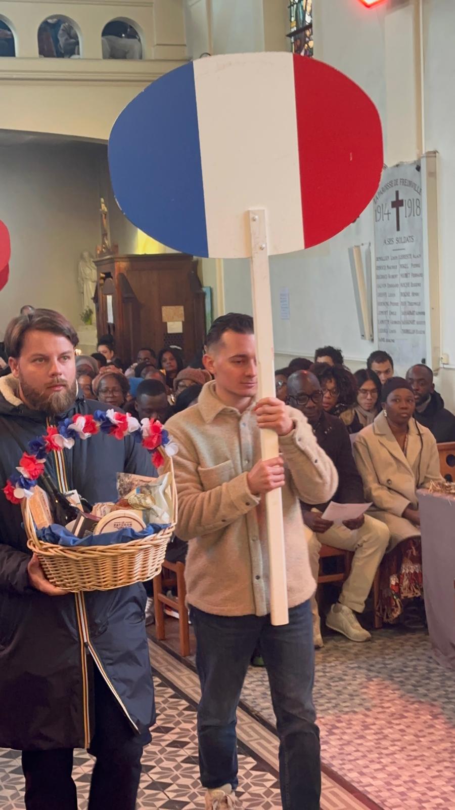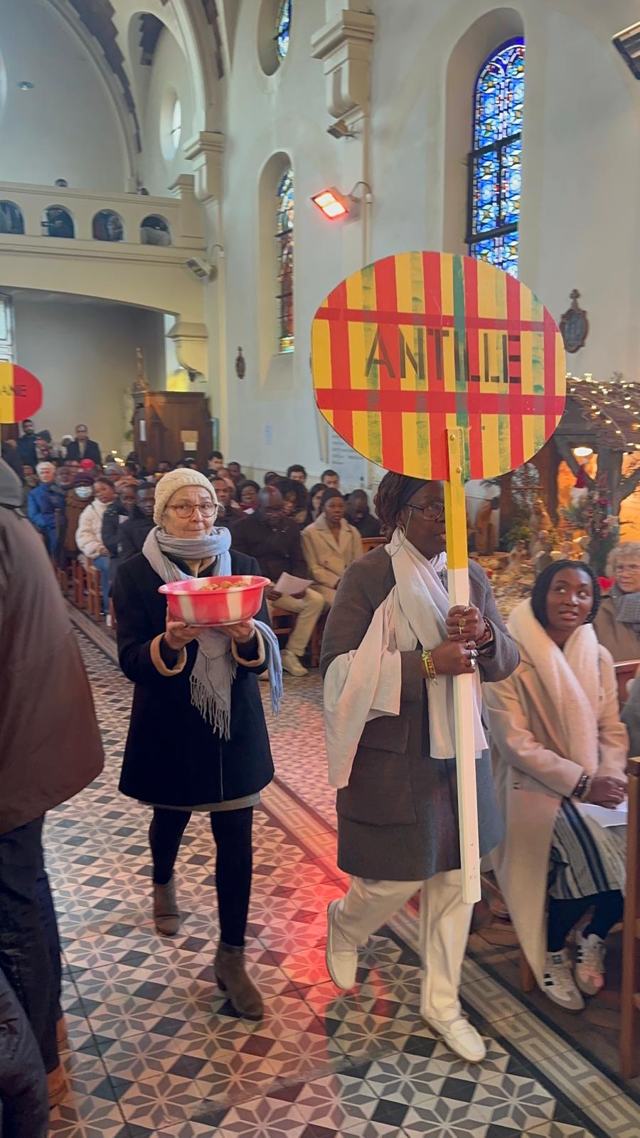 La célébration a débuté par une procession des offrandes qui a fait voyager l’assemblée à travers 7 pays, représentés par leurs panneaux et leurs spécialités culinaires : la France, les pays de l’Est, la communauté tamoule, le Portugal, l’Asie du Sud-Est, les Antilles et l’Afrique. Ces offrandes, symboles de la générosité et de l’identité culturelle de chacun, ont nourri notre prière commune et incarné la beauté de l’Église universelle.